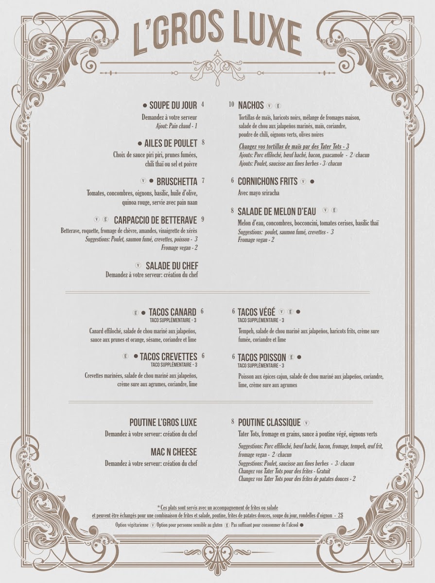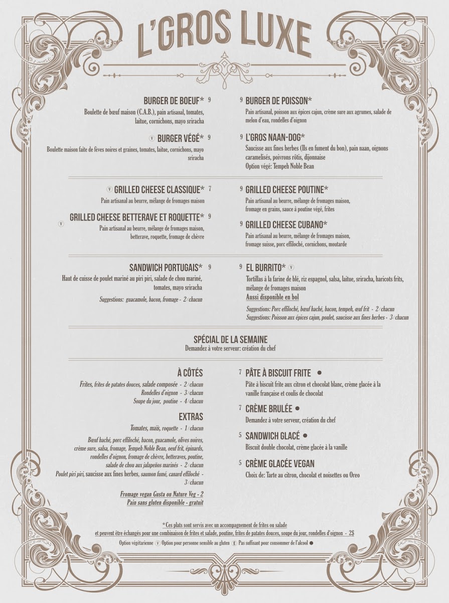 Welcome to L'Gros Luxe Québec, a vibrant bistro nestled in the heart of Québec City, where culinary creativity meets a casual dining experience. The menu offers a delicious fusion of flavors, prominently featuring signature dishes like the Fish 'N' Chips, with cod fillets battered in dill pickle chips, served alongside crispy fries and jalapeño slaw for CA$28.75.